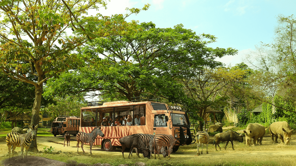 Ride along the volcanic sands of Saba Beach, then continue to Bali Safari & Marine Park for the Jungle Hopper package with exotic animals, fun shows, and a safari tram adventure.